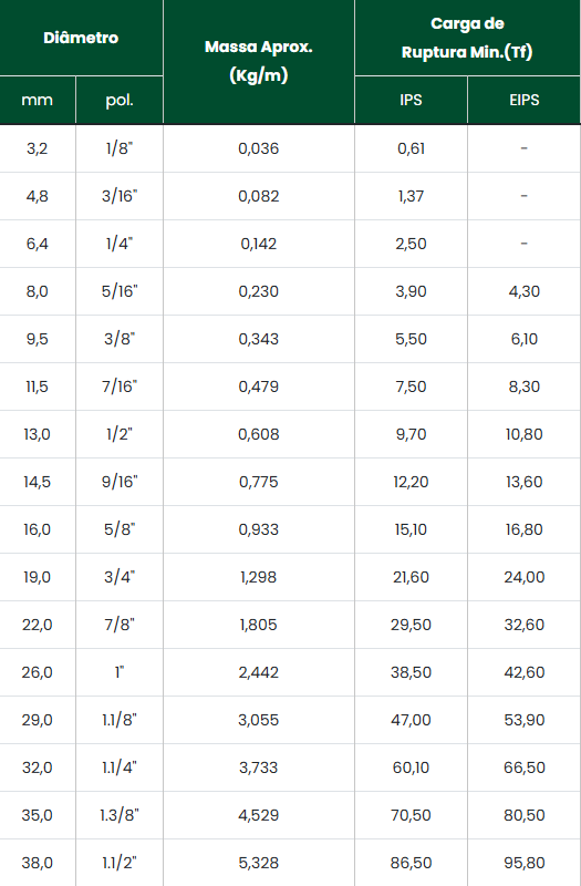 O valor da massa indicado na tabela é referencial, podendo variar em função da tolerância do passo do cabo.