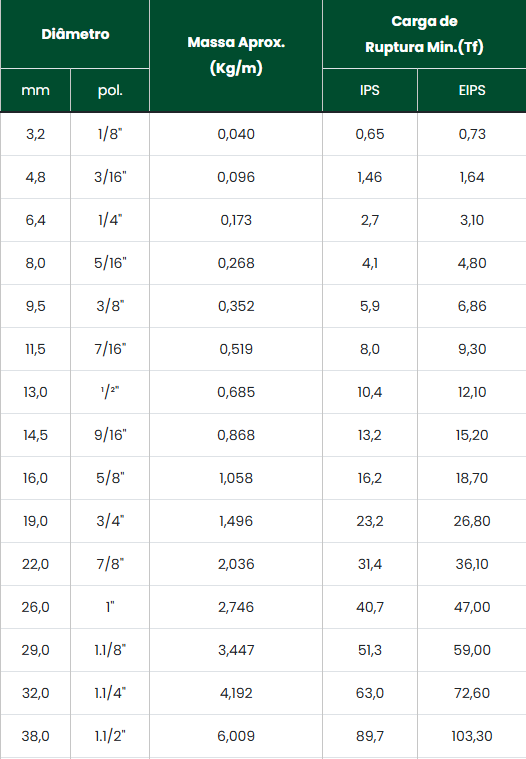O valor da massa indicado na tabela é referencial, podendo variar em função da tolerância do passo do cabo.